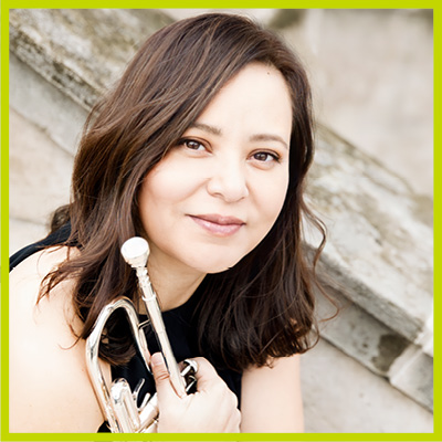 Image shows Dr. Samayoa looking to the camera holding a trumpet in her right hand